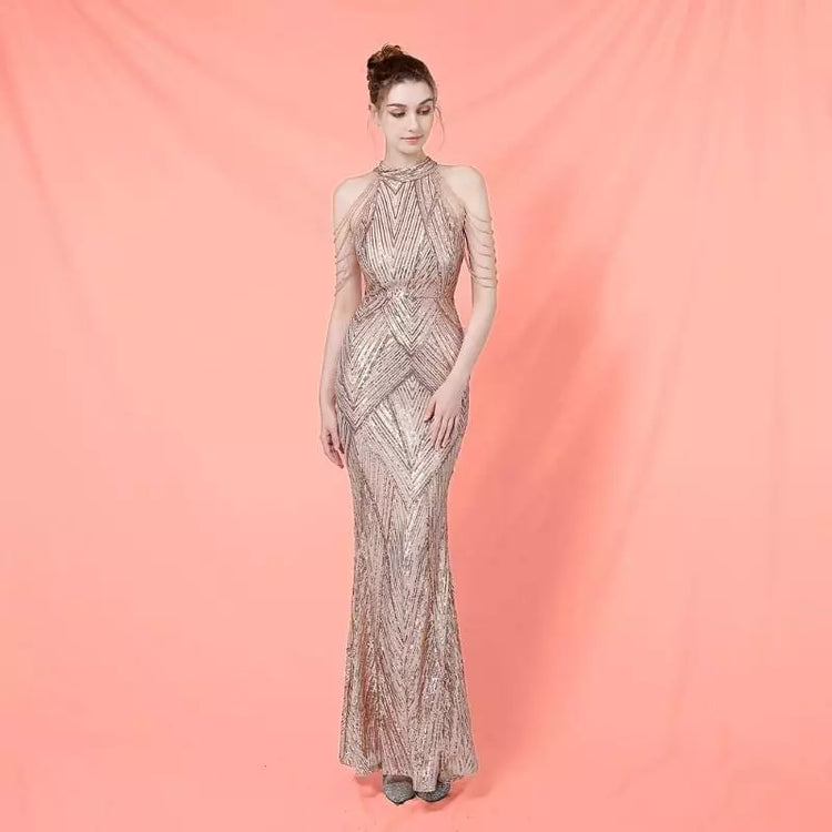 La silhouette de la robe, inspirée par les dernières tendances haute couture, présente un dos nu séduisant et une longueur parfaitement ajustée. Les détails en sequins de qualité ajoutent une touche de glamour, capturant la lumière de manière envoûtante à chaque mouvement.